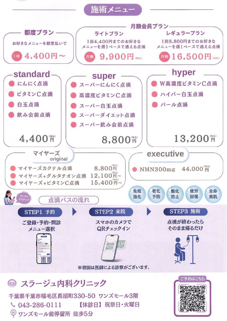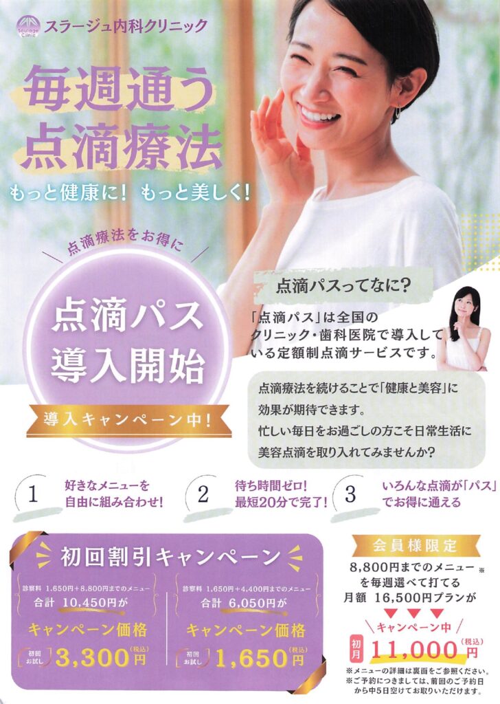このような注射・点滴には、健康保険が適用できないため敷居が高く感じる方もいらっしゃるのではとの思いから、もっと身近に気軽に受けていただける「点滴パス」を導入することにいたしました!